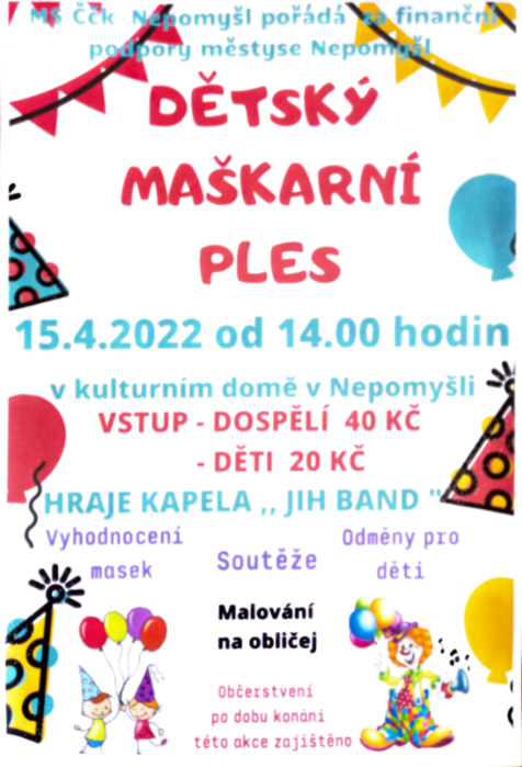 Úvod > Aktuality > ČČK Nepomyšl pořádá Dětský maškarní ples v pátek 15.4.2022 od 14.00 hod. v KD Nepomyšl