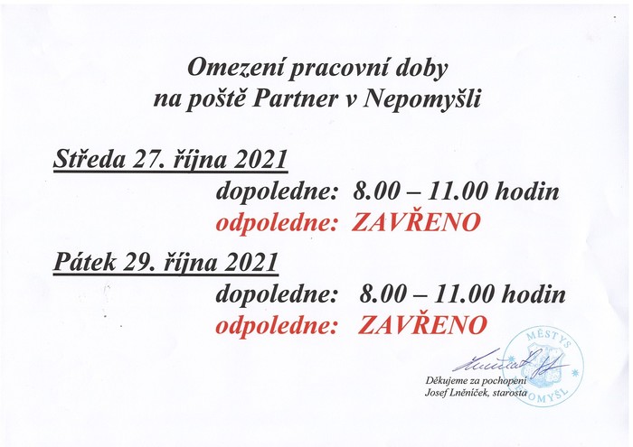 Pošta Partner v Nepomyšli - omezení pracovní doby 27.10. 2021 a 29.10.2021