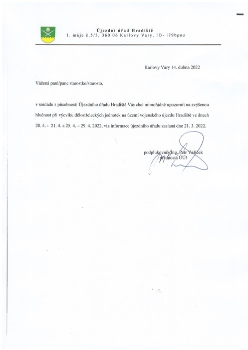 Upozornění na zvýšenou hlučnost při výcviku dělostřeleckých jednotek na území vojenského újezdu Hradiště ve dnech 20.4. - 21.4. a 25.4. - 29.4.2022.